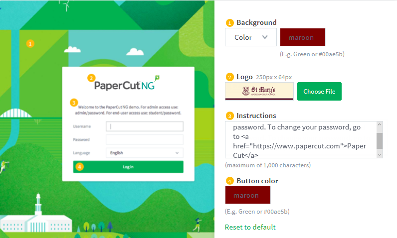 To undo the changes made and restore the default PaperCut NG/MF styling, click the [Reset to default] link.